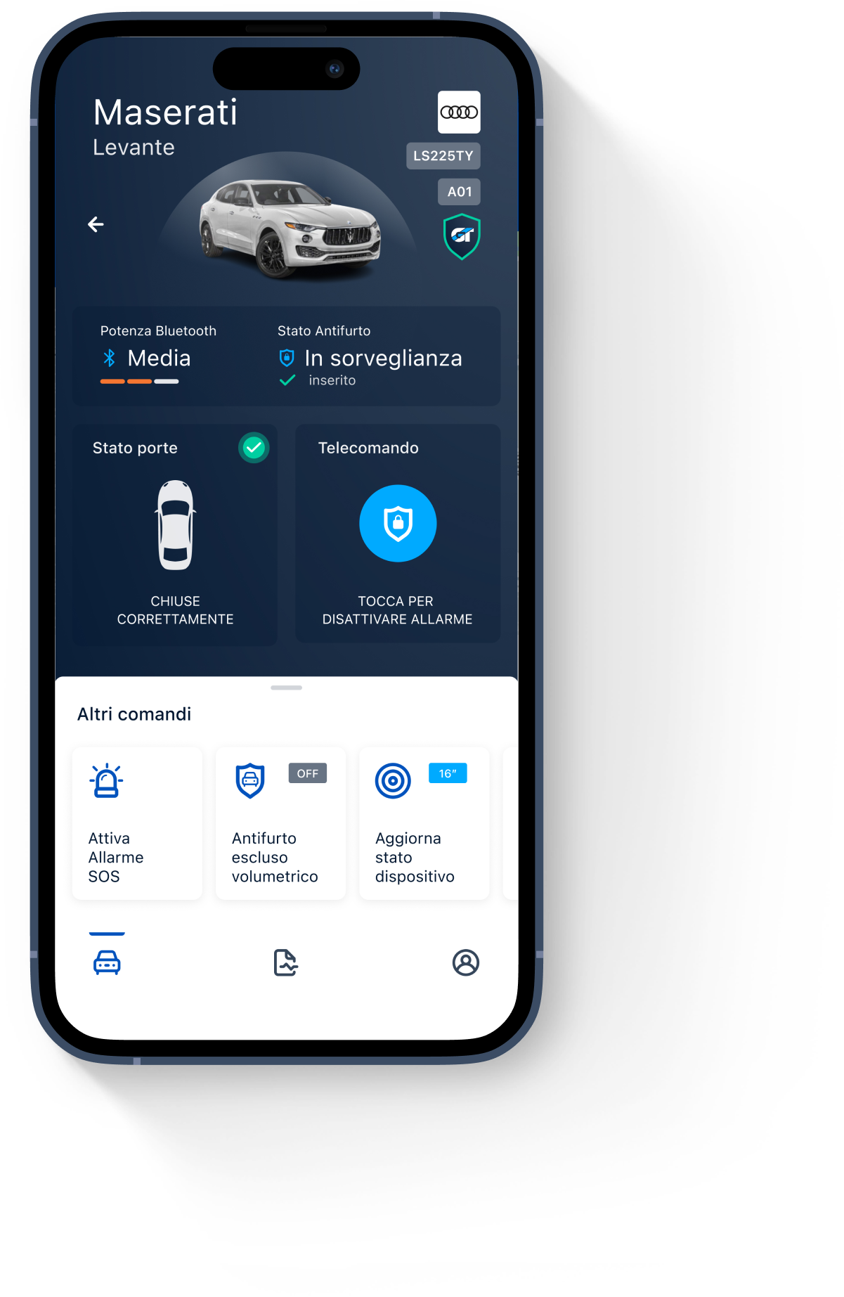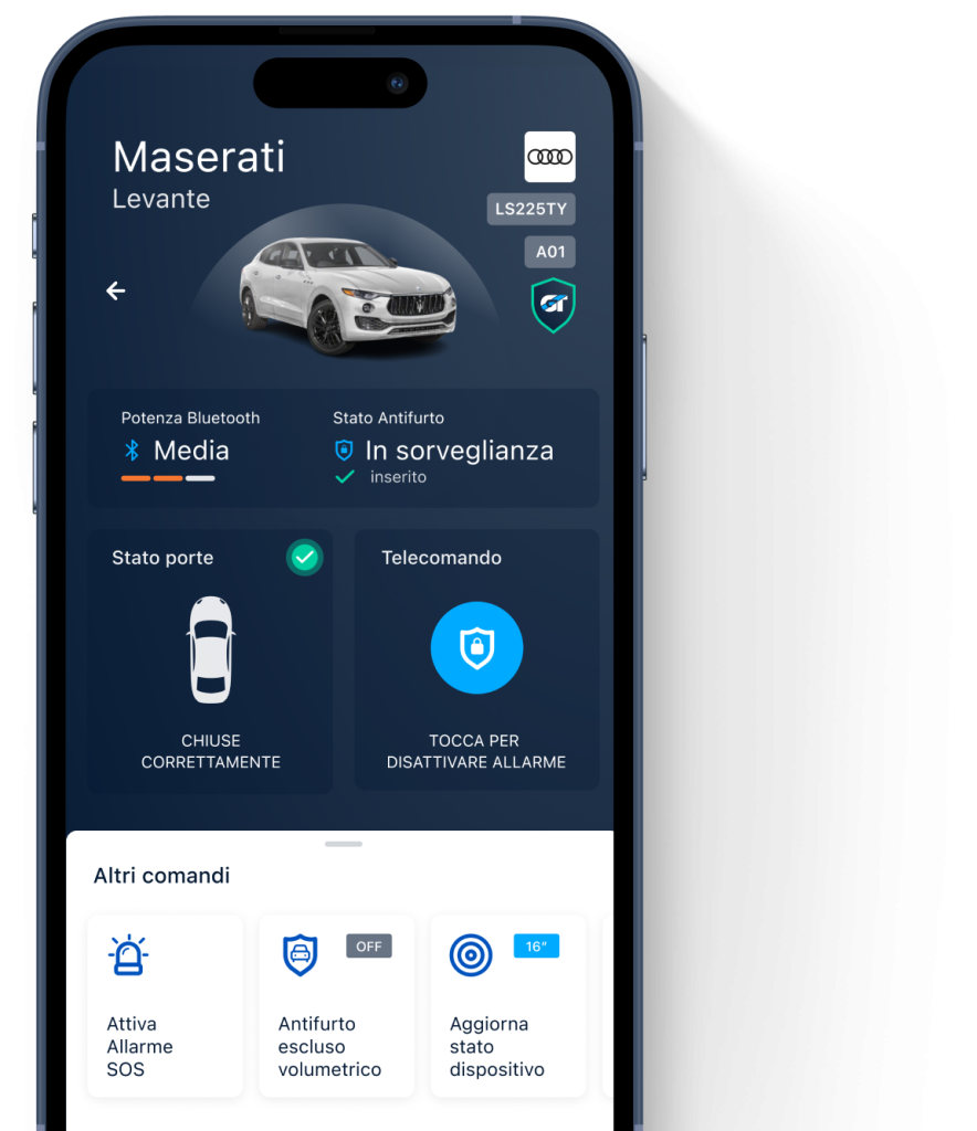Monitora il veicolo in tempo reale, blocca l’avviamento da app o web, ricevi notifiche via SMS o push in caso di eventi sospetti.